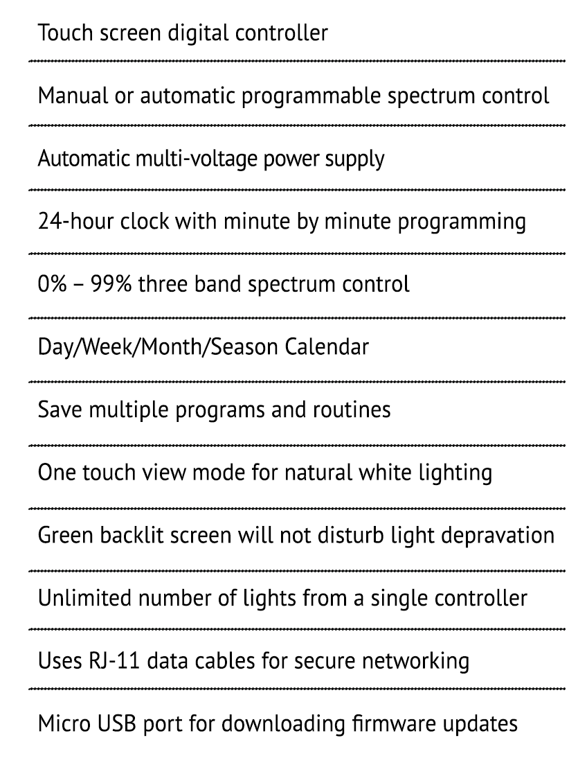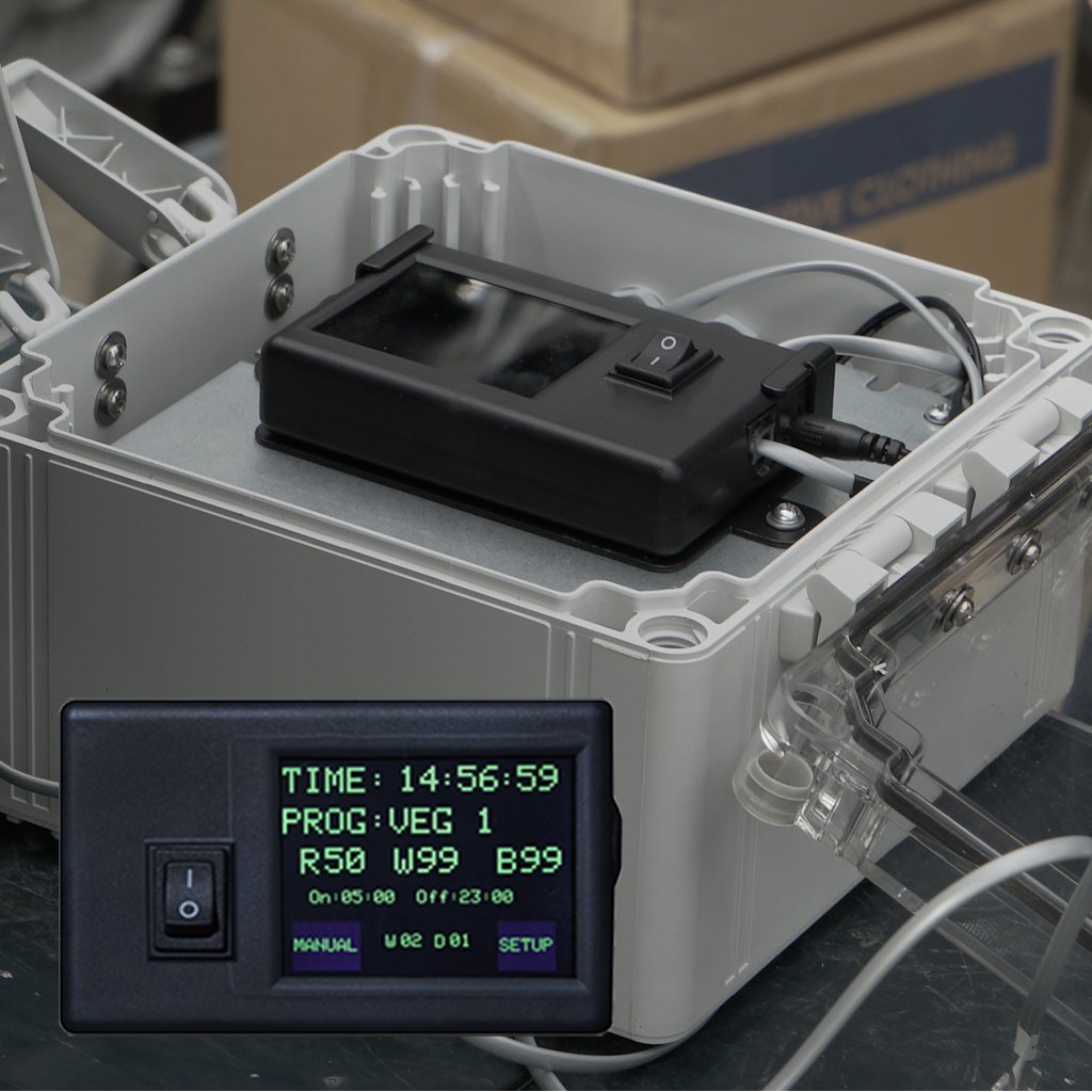 The SolarSystem Controller features programmable 0% to 99% spectrum control over three spectrum ranges – Blue, White and Red. You can use the controller in manual mode only to adjust the light spectrum or use the digital clock and calendar to run custom light recipes over a day, week, month or entire season. Programs can be saved for specific crops or strains. You can also use the view mode to work in natural white light and then switch back to high power reds and blues for accelerated growth.