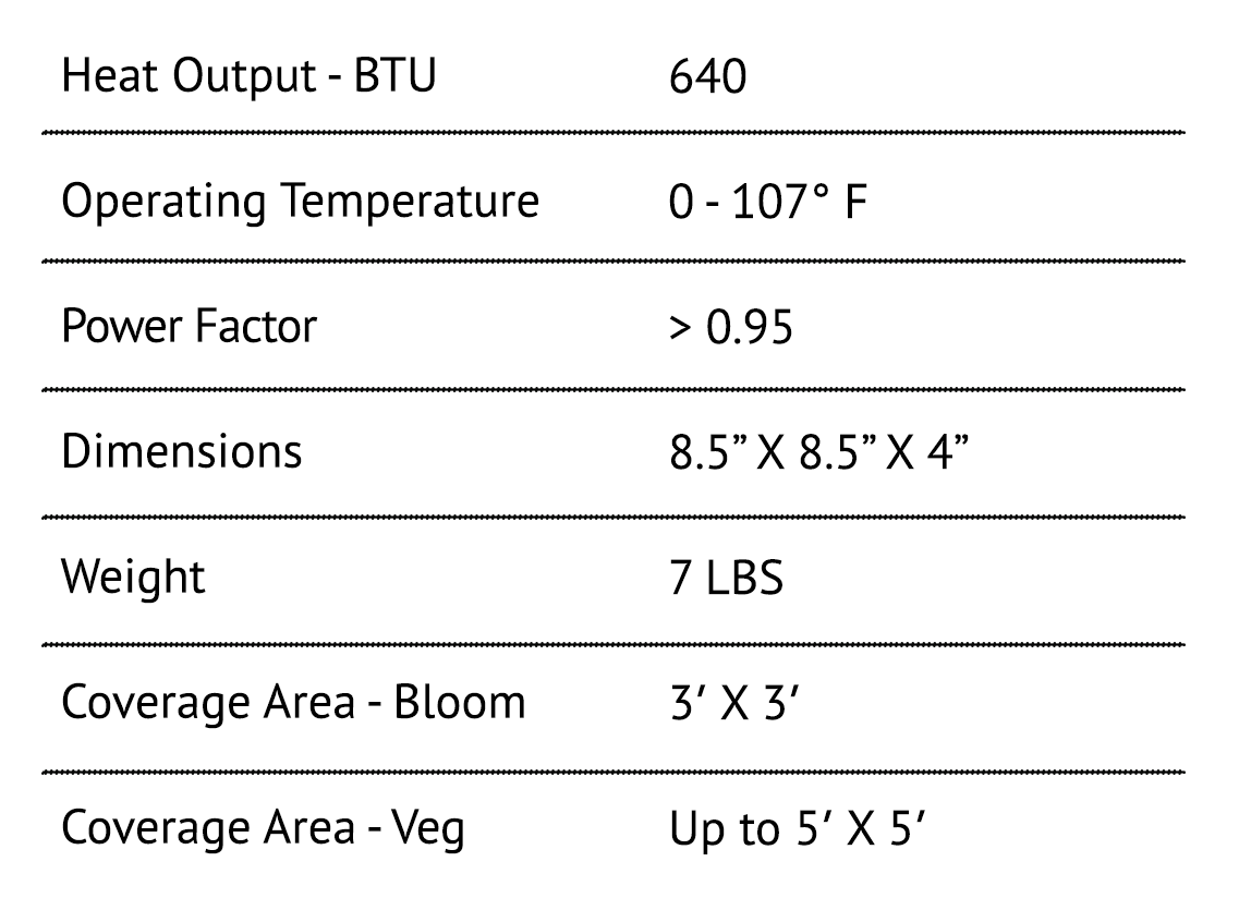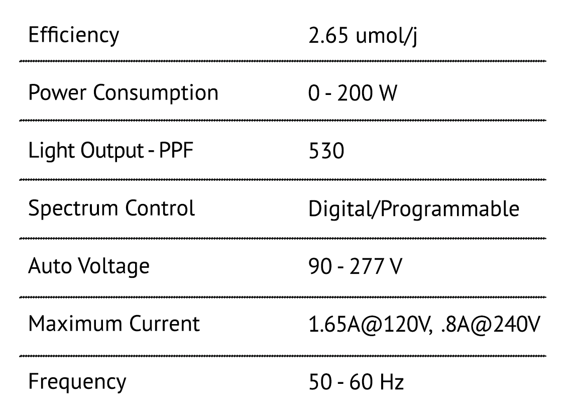 Please note that the SolarSystem 275 has 2-channel dimming, as opposed to 3 on the 550 and 1100 models. If you connect the SolarSystem Controller to this unit, the white channel will have no effect on this fixture. As a result, view mode will simply shut this light off. Please contact us if you're not sure if this fixture is right for you.The SolarSystem 275 is suited for commercial, greenhouse, and personal growers. Able to cover a 3 x 3 foot bloom area and 5 x 5 foot vegetative area, it draws a maximum of 200 watts, saving energy and cost. This LED grow light system provides all the benefits of programmable spectrum control, meaning an unlimited potential for all types of growing operations.Using all parts of the light spectrum focuses energy into wavelengths plants need to thrive.