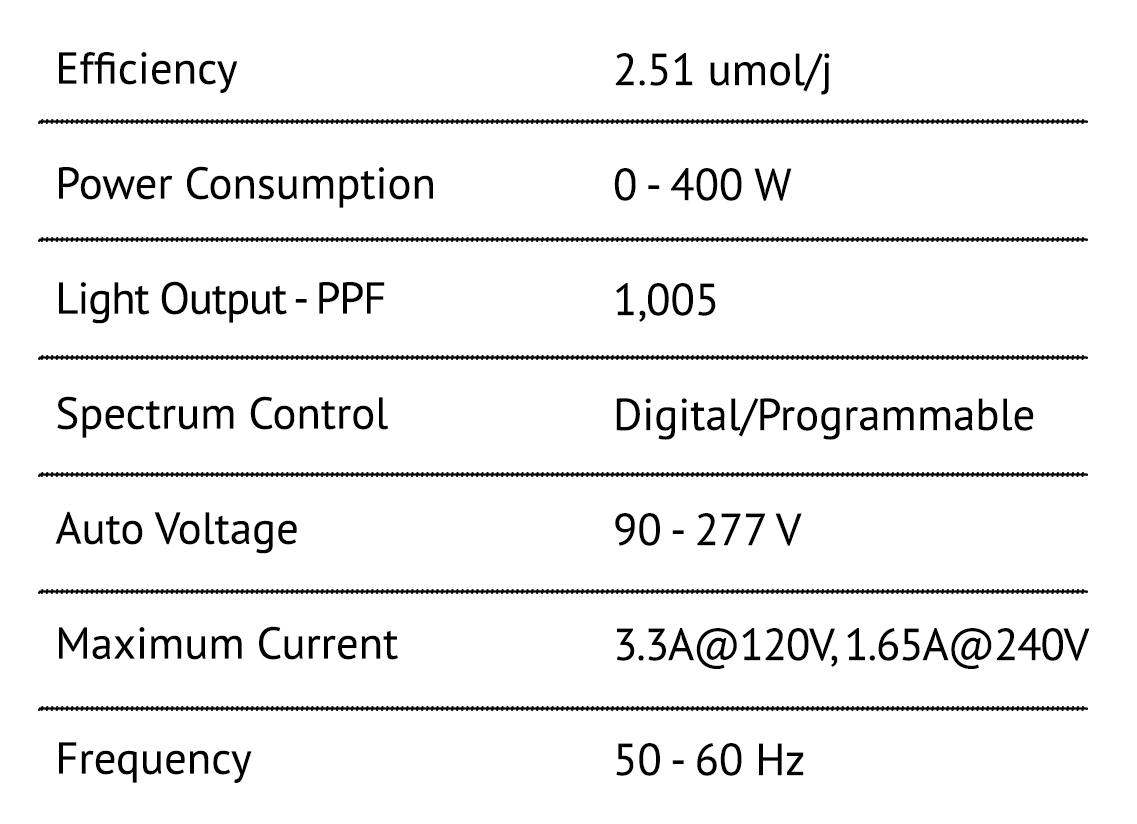 Overcoming the limitations of high-intensity discharge lighting systems, the SolarSystem 550 LED grow light system offers programmable spectrum control over multiple wavelengths. It operates at a frequency of 50-60 Hz and draws a maximum current of 3.3A @ 120 V, 1.65 A @ 240 V. Power consumption ranges from 0-400 W, which is exceptional compared to traditional UVB grow lights.